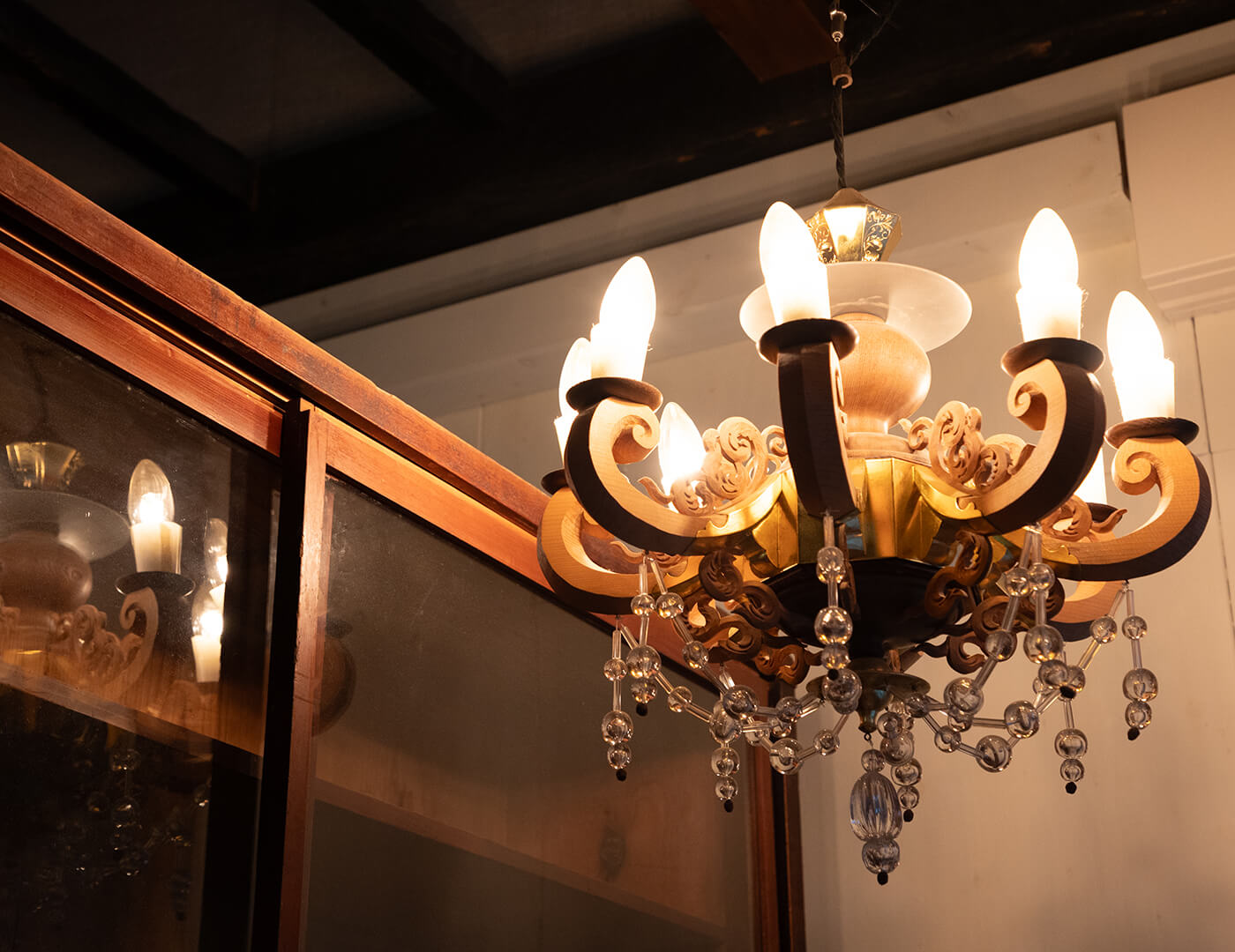 井波彫刻の伝統的なモチーフ“雲”を主役にした代表的作品や独特の雰囲気を帯びた木製シャンデリア、松竹梅のモチーフに彩色を施したスワッグ(壁飾り)。木彫の魅力や可能性を引き出す柔軟な発想と卓越したセンス、それを形にする技術を基に、彫刻家・前川大地さんの作品はいずれも伝統の中から生まれ、伸びやかに今を体現している。