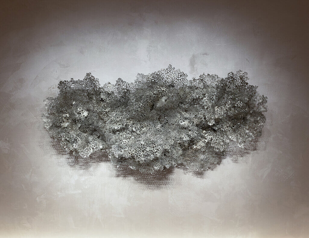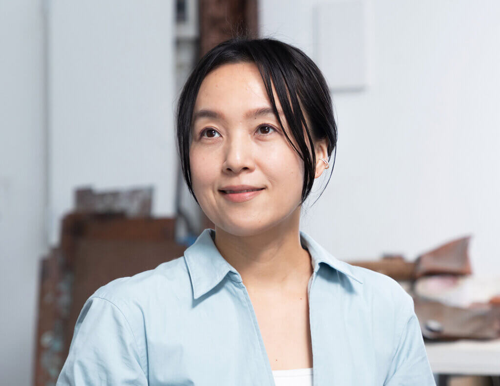 彼女の作品の特徴のひとつに「錫釉銅(すずゆうどう)」がある。陶芸の釉薬が窯の中で炎の力によって景色を生み出すように、あえて自然に委ねる要素を取り入れている。その作用として、作品には思いがけない表情が静かに浮かび上がるという。こうした手法は、幼い頃から身近に感じてきた陶芸がヒントとなった彼女ならではの表現法だ。静と動が同時に息づく造形は、ひそやかな緊張をまとう。金属という素材から想像される冷たさや硬さがそっと影を潜め、むしろ、どこかやわらかく感じられる。