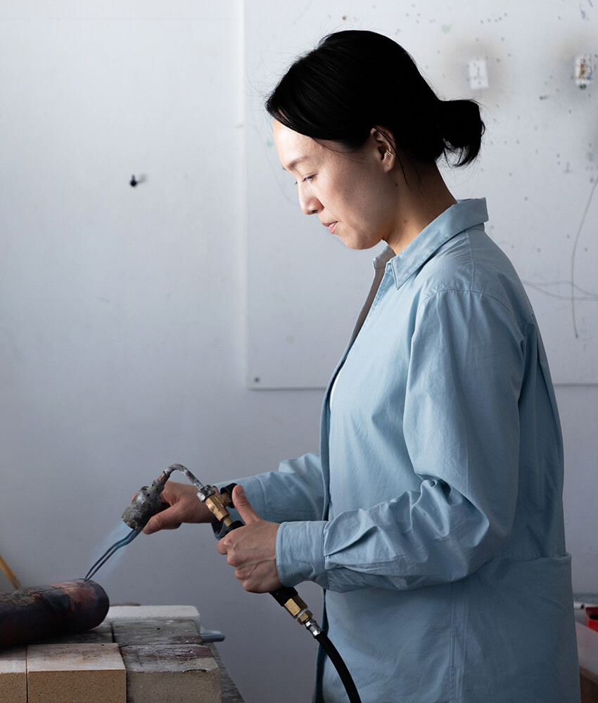 彼女の作品の特徴のひとつに「錫釉銅(すずゆうどう)」がある。陶芸の釉薬が窯の中で炎の力によって景色を生み出すように、あえて自然に委ねる要素を取り入れている。その作用として、作品には思いがけない表情が静かに浮かび上がるという。こうした手法は、幼い頃から身近に感じてきた陶芸がヒントとなった彼女ならではの表現法だ。静と動が同時に息づく造形は、ひそやかな緊張をまとう。金属という素材から想像される冷たさや硬さがそっと影を潜め、むしろ、どこかやわらかく感じられる。